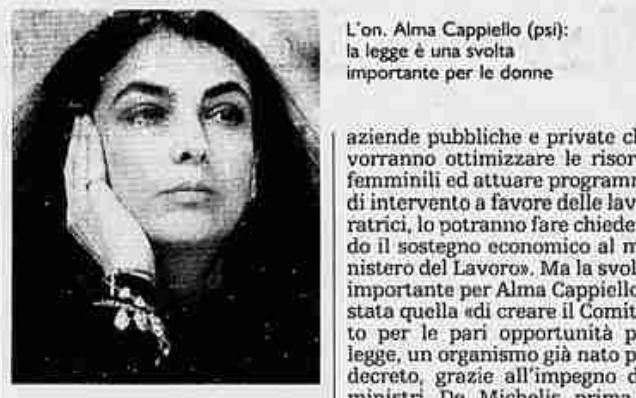 Voci a sostegno del punto di vista del giornalista: Alma Cappiello, responsabile nazionale delle donne socialiste, si è detta soddisfatta. Attraverso questa legge «d'ora in poi le aziende pubbliche e private che vorranno ottimizzare le risorse femminili ed attuare programmi di intervento a favore delle lavoratrici, lo potranno fare chiedendo il sostegno economico al ministero del Lavoro». Ma la svolta importante per Alma Cappiello è stata quella «di creare il Comitato per le pari opportunità per legge, un organismo già nato per decreto, grazie all'impegno dei ministri De Michelis prima e Formica poi, e non più riattivato successivamente»